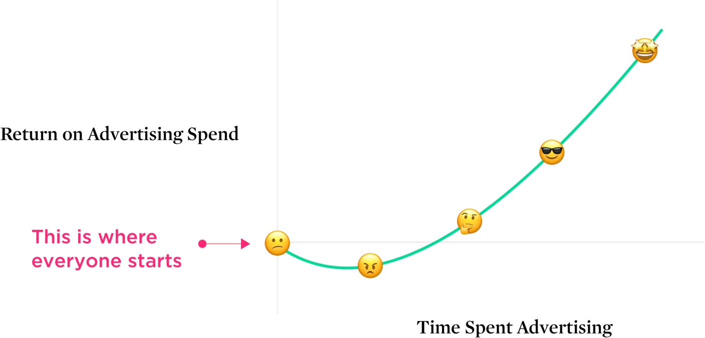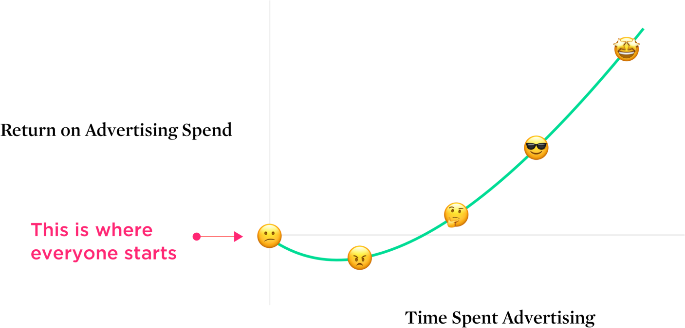 Managing expectations is crucial. The benefits of running a Facebook ad campaign grow over time. Those benefits mimic a customer acquisition curve that is bound to be familiar.