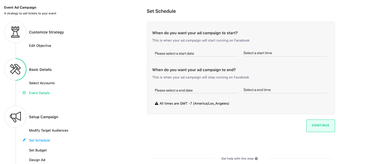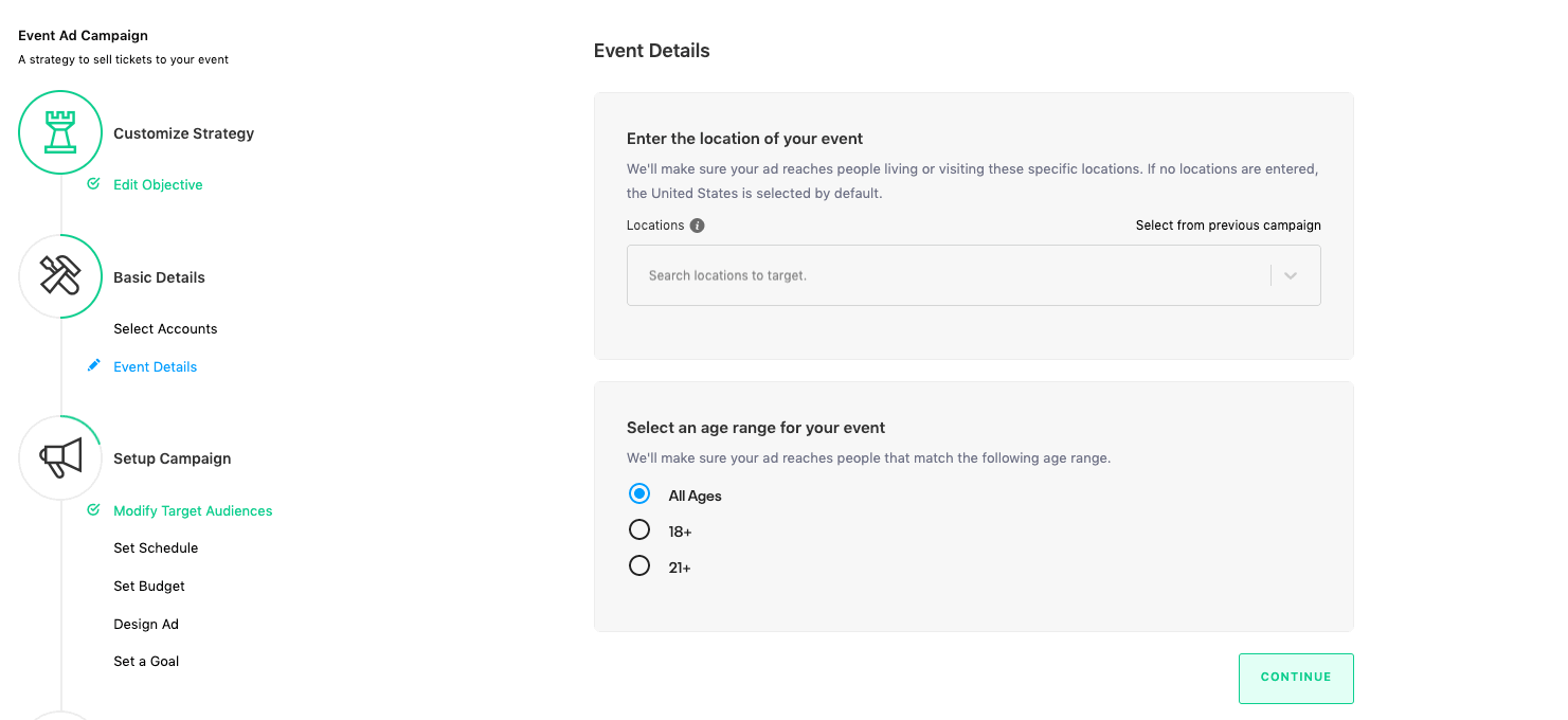 Choose whichever Age Range suits your event the best. It is recommended that you do not further alter the age range in the Modify Target Audiences step as Facebook will automatically optimize who to serve ads to within the age demographic.