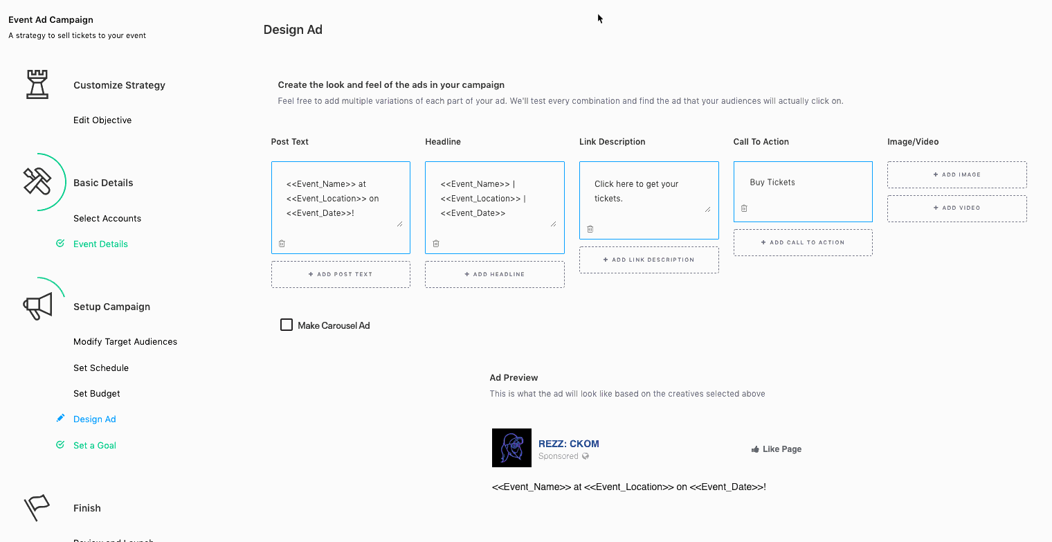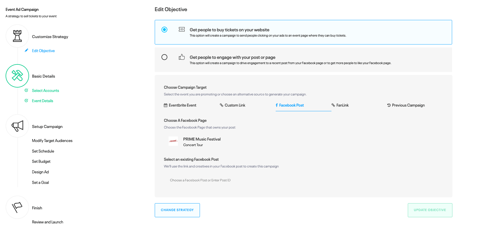 Objective: Select "Get people to buy tickets on your website"