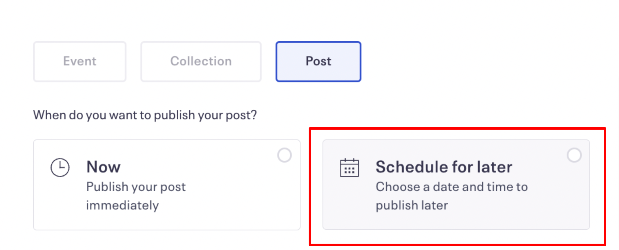 1. Choose the type of post you want to share: are you seeking to invite people to an event, to get to know a collection you've created, or are hoping to write a post free-hand?&#x20;