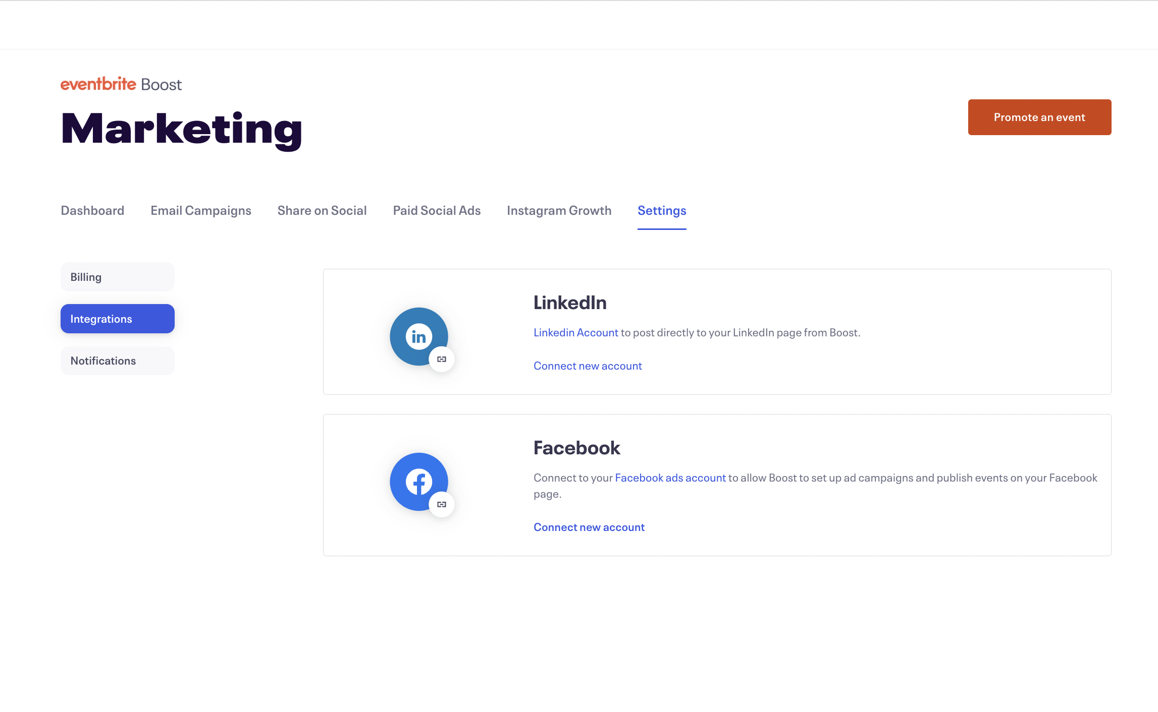 Once you have connected your LinkedIn account, you can view and manage your LinkedIn connection by heading to the "Settings" section within Eventbrite Boost's Marketing Hub. From there, you may select "Integrations" and view or change the connected LinkedIn account. &#x20;