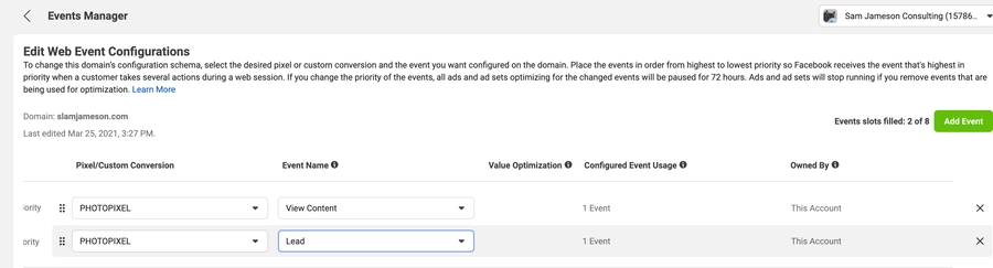 It means you still have one final step left for getting your custom domain setup for conversion ads! Last thing you'll need to do is to make sure you specify what Facebook Pixel events you'd like Facebook to prioritize tracking!